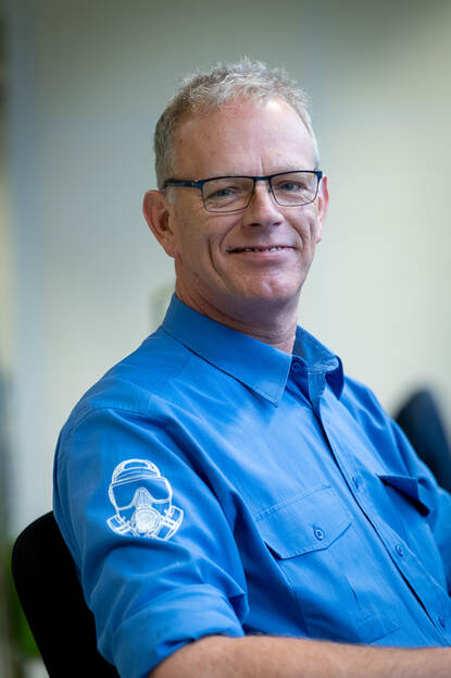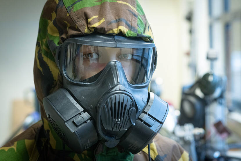 Hans controleert een gasmasker.