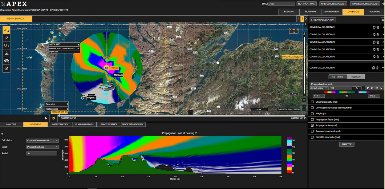 APEX rekent heel veel gegevens door zoals omgevingsfactoren en weersomstandigheden aan het aardoppervlak, maar ook in de ruimte. “Daarmee berekent het programma je huidige dekking en hoe je de beste dekking krijgt”, geeft Van Leijen aan. “Als er geen verbinding mogelijk is, komt APEX met een advies, bijvoorbeeld gebruik van een tussenstation of een andere antenne. Of geen gewone radio, maar satellietcommunicatie, want dan zit die hinderlijke berg er niet tussen. Wachten tot de avond of tot de weersomstandigheden anders zijn, kan ook een oplossing zijn, want radiobereik is sterk afhankelijk van weer- en terreincondities.”