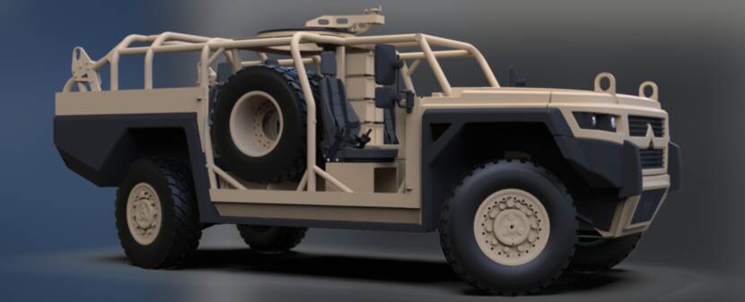 De kolos van 8,8 ton is gebaseerd op de Vector (Versatile Expeditionary Commando Tactiële off-road) die inmiddels bij het Korps Commandotroepen in gebruik is. In de gesloten uitvoering van de Mammoth (mammoet) zijn de gevoelige voertuigcomponenten beschermd tegen kleinkaliber wapens en al dan niet geïmproviseerde explosieven. Het voertuig krijgt zoals gebruikelijk vierwielaandrijving én vierwielbesturing. Dat resulteert in een zeer beperkte draaicirkel van slechts 12,5 meter en dat voor voertuig van 5,6 meter lang. (foto: Defenture)