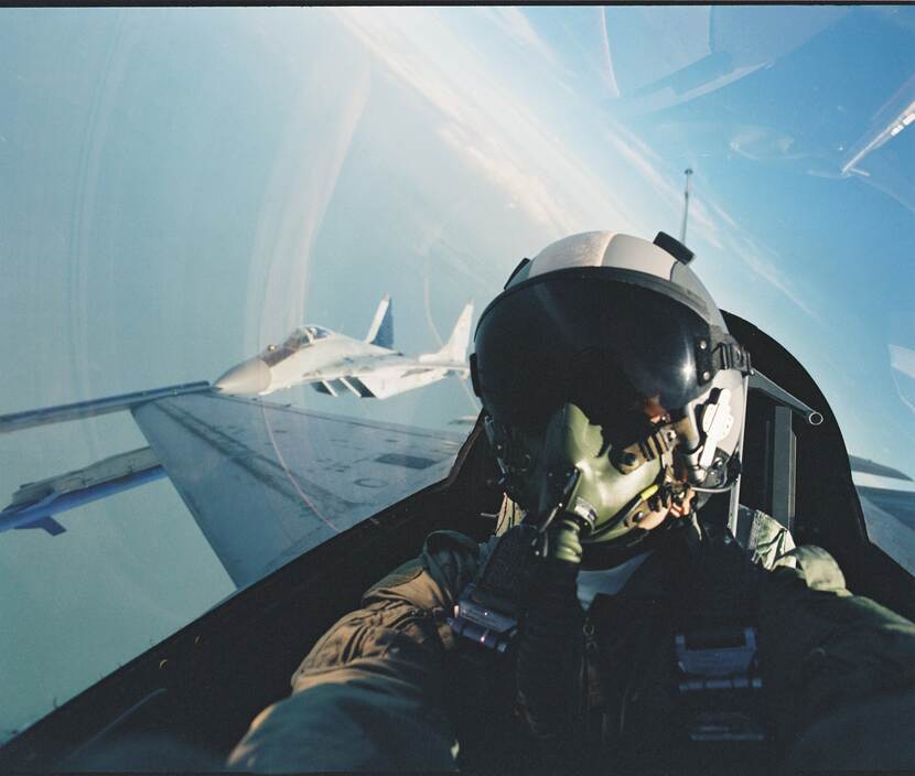 Op de foto van het NIMH een MiG-29 van de Slowaakse luchtmacht gezien vanuit de cockpit van een Nederlandse F-16 in 1999.