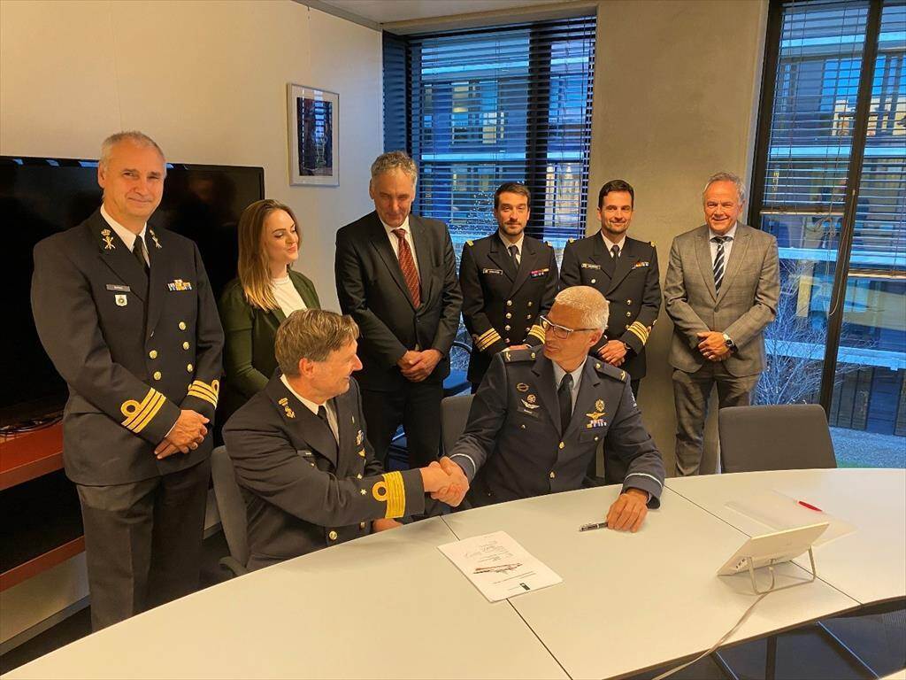 Directeur Wapensystemen en Bedrijven, commodore Harold Boekholt en commandeur Cees Vooijs, plaatsvervangendcommandant JIVC, zetten hun handtekening onder het projectvoorstel nieuw onderzeeboot-bestrijdingsfregat.