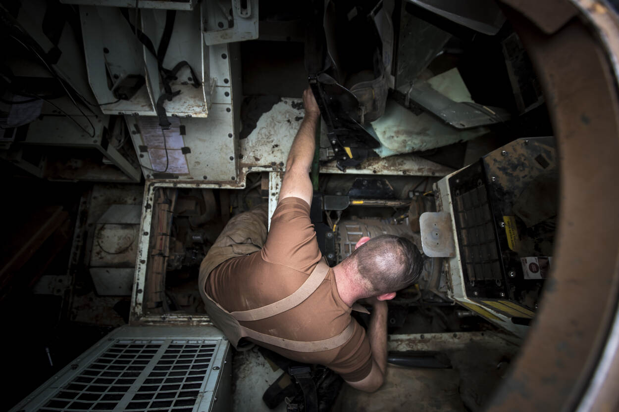 Onderhoud vereist soms veel vertrouwen en geduld. Neem de midlife update van de Fennek, zegt Meijer. “We zitten in een overgangsperiode die een aantal jaren zal duren. Gedurende die periode rijden er Fenneks rond met veel verschillende configuraties en onderdelen. Dat vraagt veel van de gebruikers en de onderhoudsgroep.” (Foto: sergeant-majoor Maartje Roos)