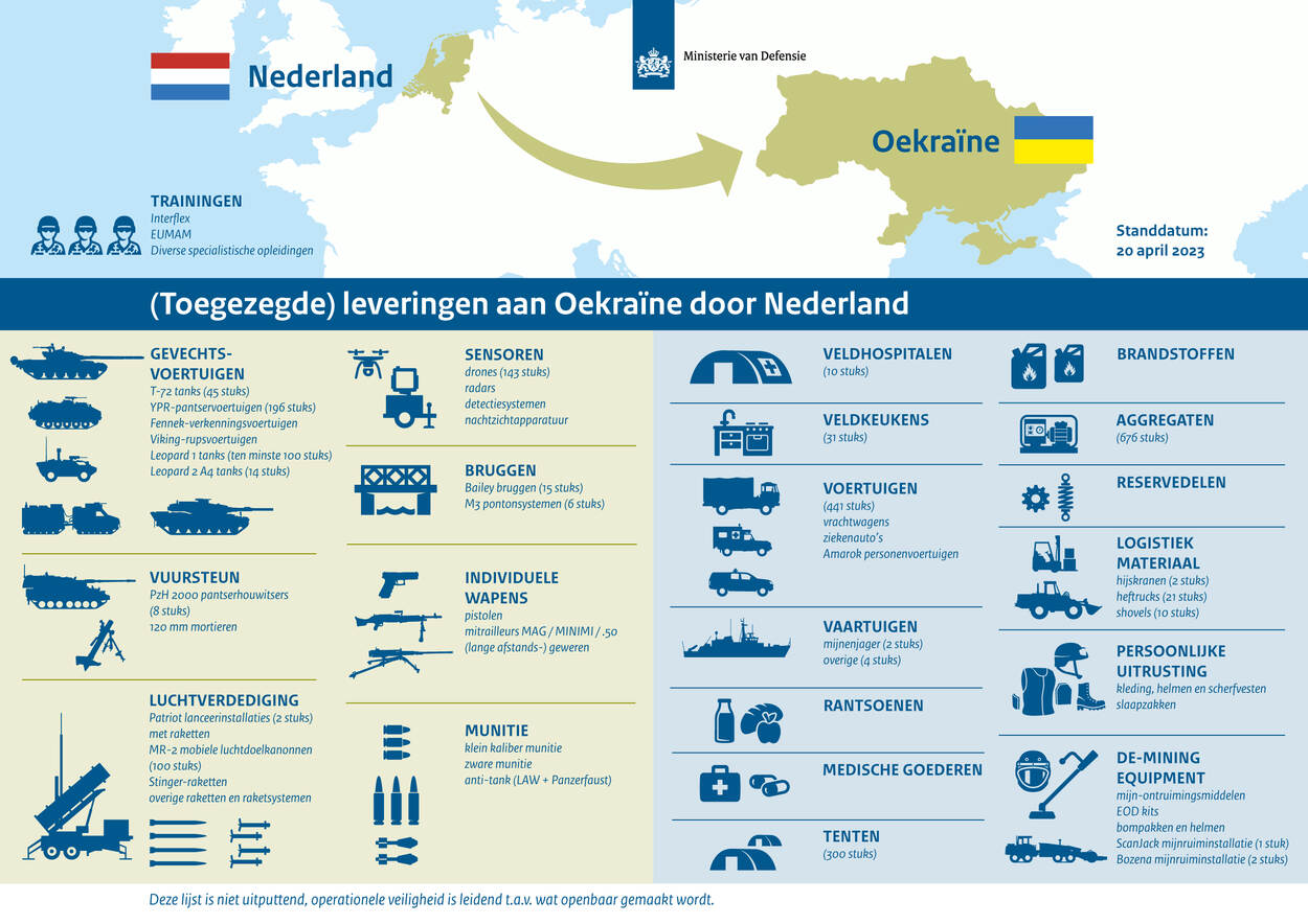 Defensie maakt voortaan meer informatie openbaar over de militaire leveringen aan Oekraïne. Dit schreef minister Kajsa Ollongren op 13 april in een brief aan de Tweede Kamer. Er is bekendgemaakt wat voor type goederen en middelen zijn gedoneerd sinds 24 februari 2022. Hierdoor wordt voor het eerst de breedte, diversiteit en omvang van de Nederlandse militaire steun inzichtelijk gemaakt. Nederland heeft inmiddels ter waarde van € 1,2 miljard aan militaire steun geleverd aan Oekraïne.