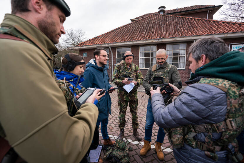 Nick Muller (links) in het commandocentrum waar een bataljonshoofdkwartier wordt nagebootst. Hij is voor deze veldtest de testcoördinator.