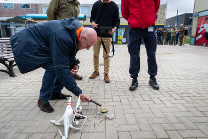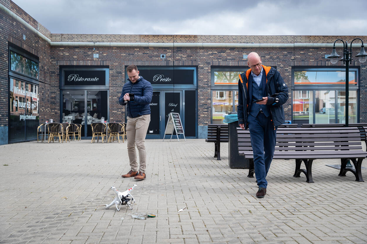 Op het ‘dorpsplein’ is een drone gecrashed waarbij een glazen pot met onbekende vloeistof is gebroken.