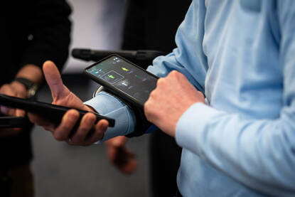 Elke trainee krijgt een polsbandje met een transponder en een apparaat dat als detector dient mee.