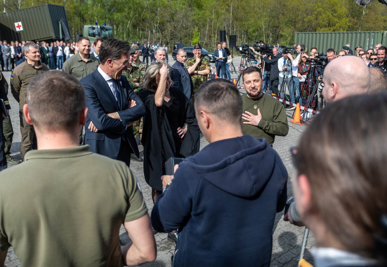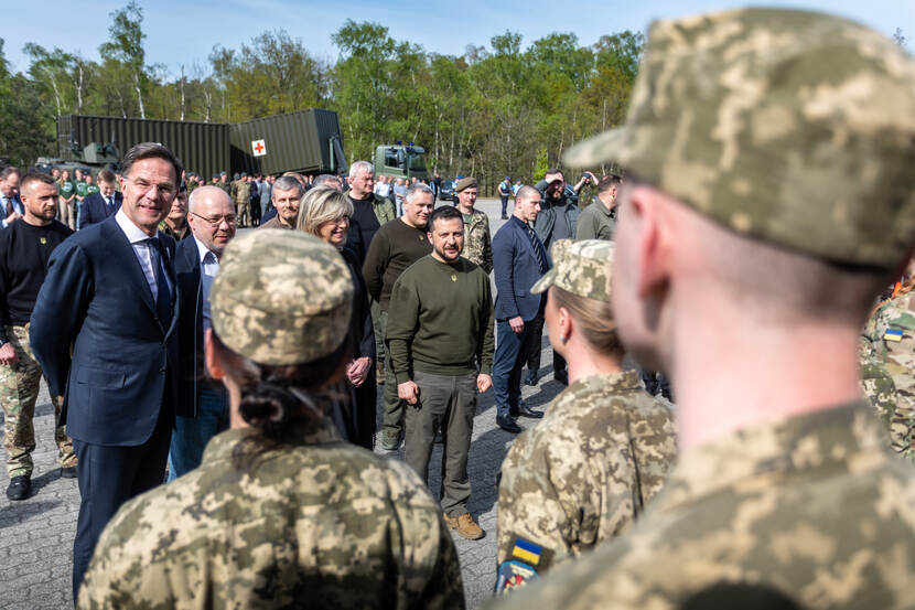 Premier Rutte, defensieminister Ollongren en president Zelensky ontmoeten Oekraïense militairen die in Nederland in opleiding zijn.