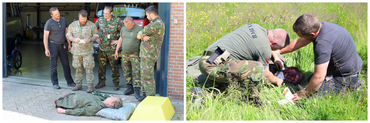 ‘Muntecher’ en veteraan adjudant Manuel vindt dat laatste heel belangrijk. “We zijn meestal met z’n tweeën aan het werk op de Defensieterreinen, dus we zijn afhankelijk van elkaar.” Nieuwe protocollen als MARCH (Massive bleeding, Airway, Respiration, Circulation en Hypothermia) en HOLK (hoofd, oksels, lies en knie) noemt Manuel ‘een goede ontwikkeling’ binnen Defensie. “Maar wat als we hulp krijgen van civiele ambulances? Kennen die het protocol? Weten ze wel hoe je een bommenpak uittrekt?”