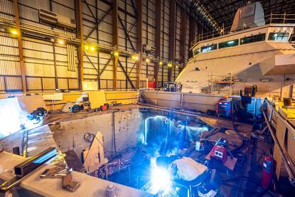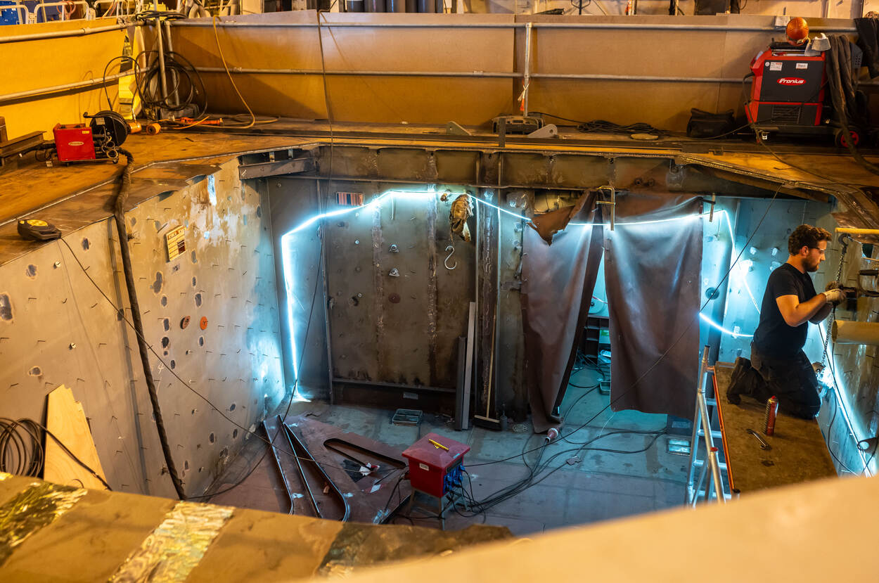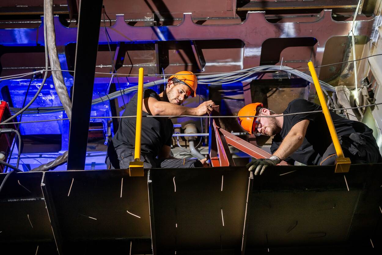 Technicus plaat- en scheepsbouw Leon Schouten kent de uitdagingen van het plaatsen van nieuwe constructiedelen op bestaande dekken, waar zich vervormingen vertonen door het varen. “Maar eigenlijk is dat vooral voor de engineers ingewikkeld; voor ons valt het wel mee, omdat wij meer op hun aangeven zorgen voor de uitvoering. Ons werk bestaat vooral uit het wegslijpen van oude delen en het lassen van fundaties voor de nieuwe dekken of verstevigingen in bijvoorbeeld de trimtank. Ik vind het mooi en spannend dat wij met een relatief jonge ploeg deze prestigeklus mogen doen. De doelstelling is uiteraard dat we volgend jaar een werkend eindproduct afleveren.”