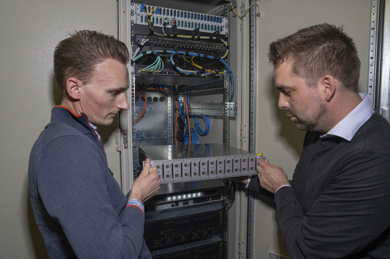 Teun de Groot en Tim de Wolf plaatsen een module met datadiodes in een serverrek