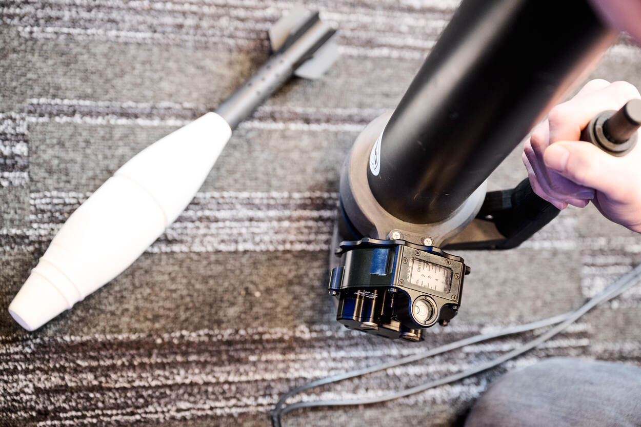 En dan is het een kwestie van de luchtbel op het richtmiddel precies in het cirkeltje laten vallen, vergelijkbaar met een waterpas. Zonder de schietbuis te veel te verplaatsen, moet deze richting het doel bewegen. Het knopje indrukken en... boem. Je virtuele doel raken. “Als dat niet lukt, merk je direct dat je iets fout doet. De sensoren lezen precies hoe schuin de buis staat. Ook de instructeur kan snel duidelijke feedback geven, omdat hij of zij op het instructeursstation precies ziet hoe ver de schutter van het doel zit.” Los van raak schieten, is de virtuele wereld een goede plek om richtmiddelen opnieuw aan te richten. “Net als we gewend zijn in de KKW-sim. Ook dat is leeropbrengst.”
