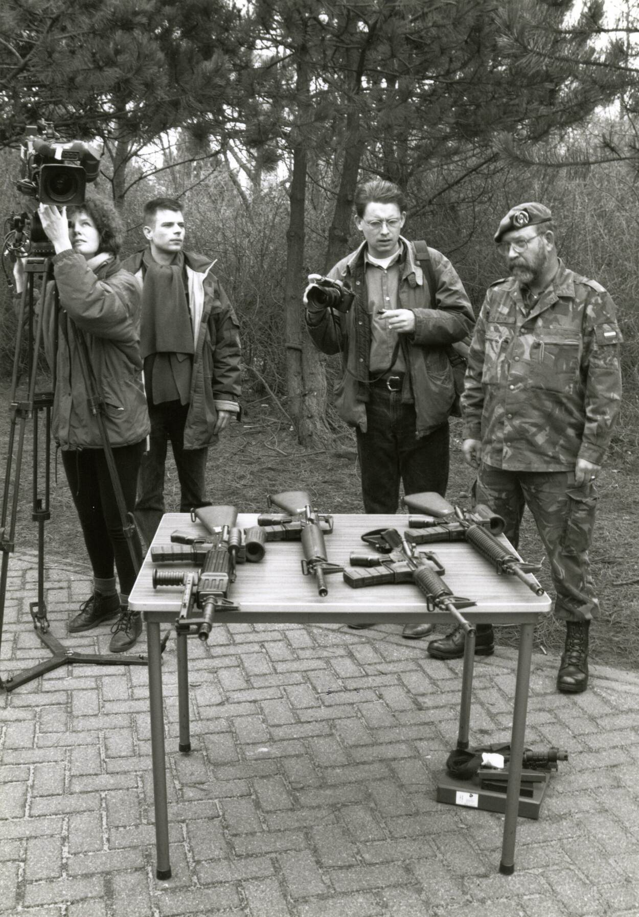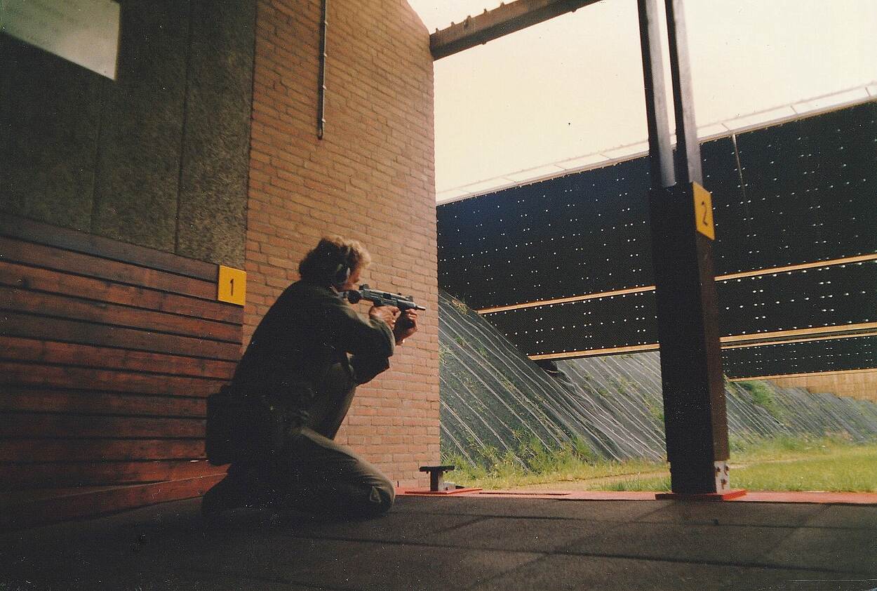 Joan Plaatsman met Uzi op de schietbaan in zijn NatRes-tijd. Er was veel media-aandacht voor de nieuwe Diemaco. Hier presenteert een adjudant de vier varianten aan journalisten.