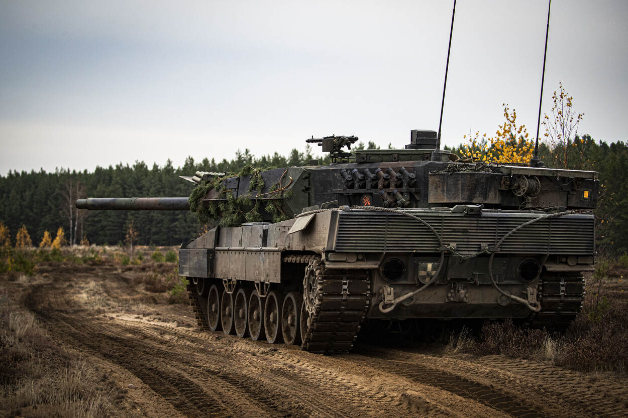Vurende Leopard 2A6 in de bossen van Litouwen tijdens de oefening Iron Wolf in 2021.