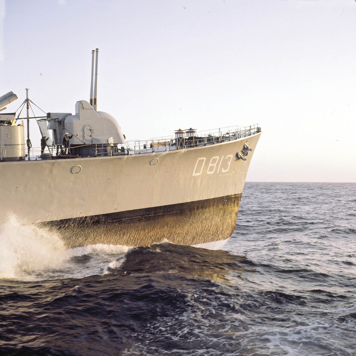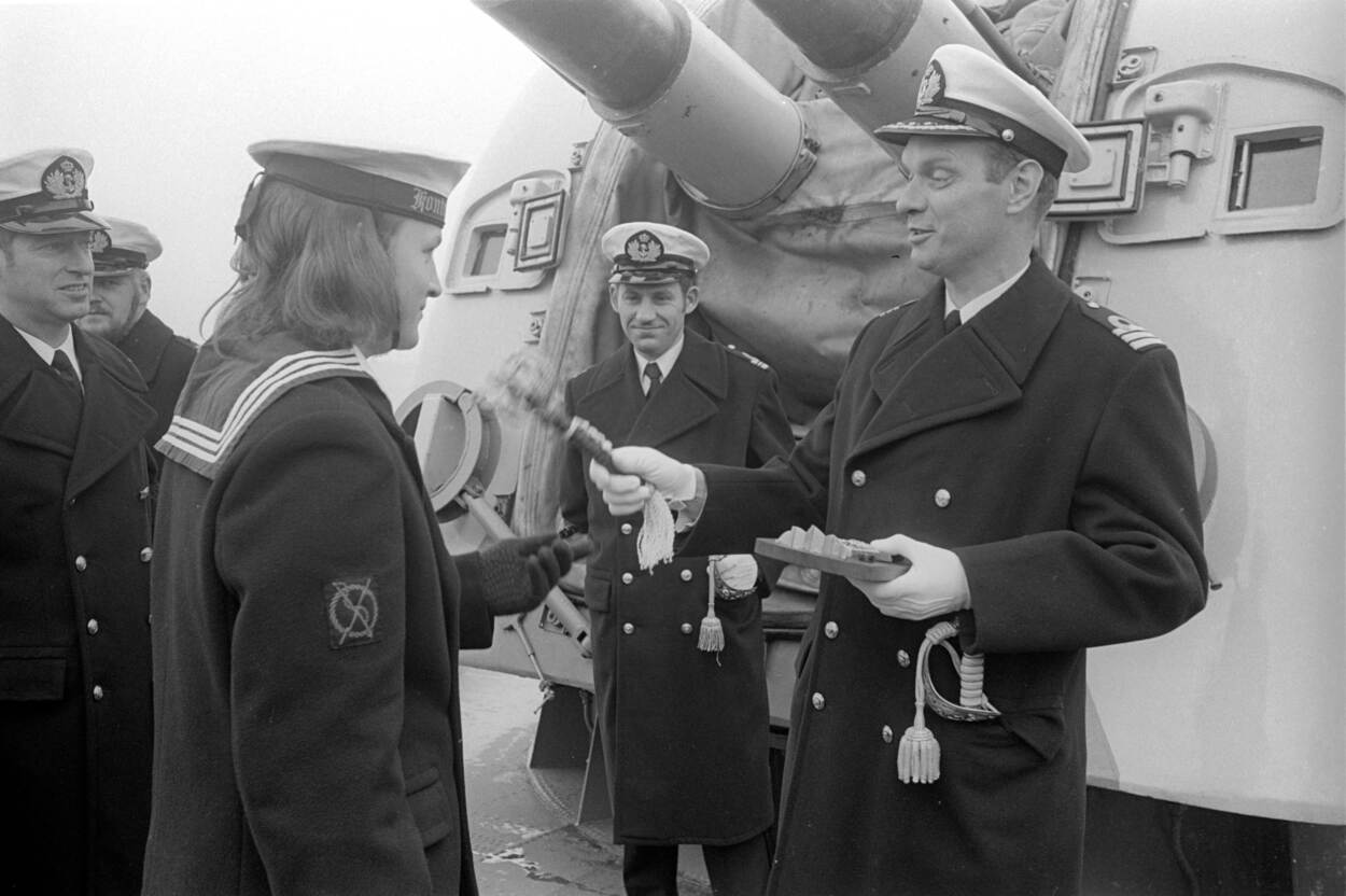 Commando-overdracht van de onderzeebootjager Hr.Ms. Gelderland (D 811) in april 1973, voor een van de geschuttorens.