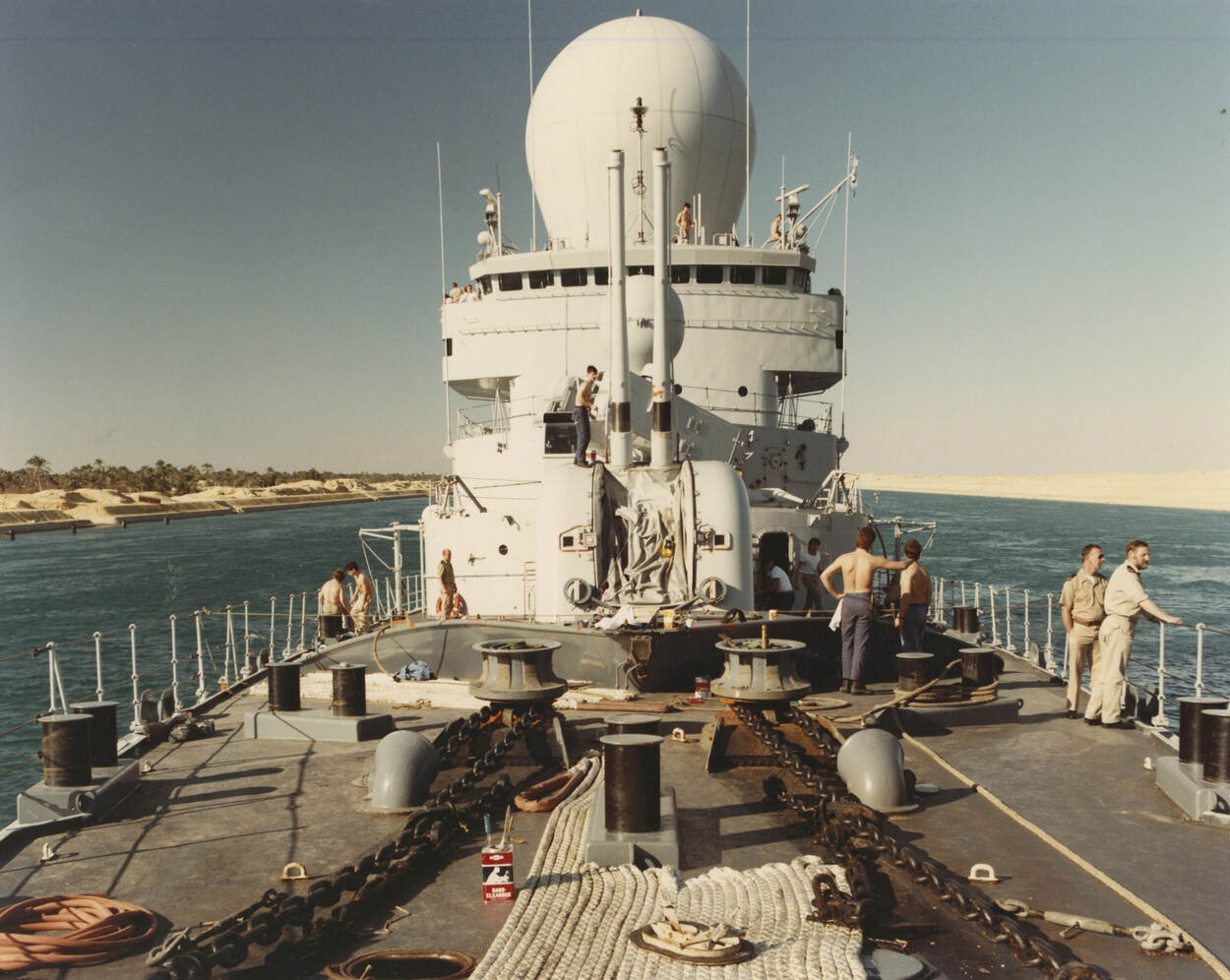 Hr.Ms. De Ruyter met Bofors in hoge elevatie tijdens doorvaart door het Suez-Kanaal.