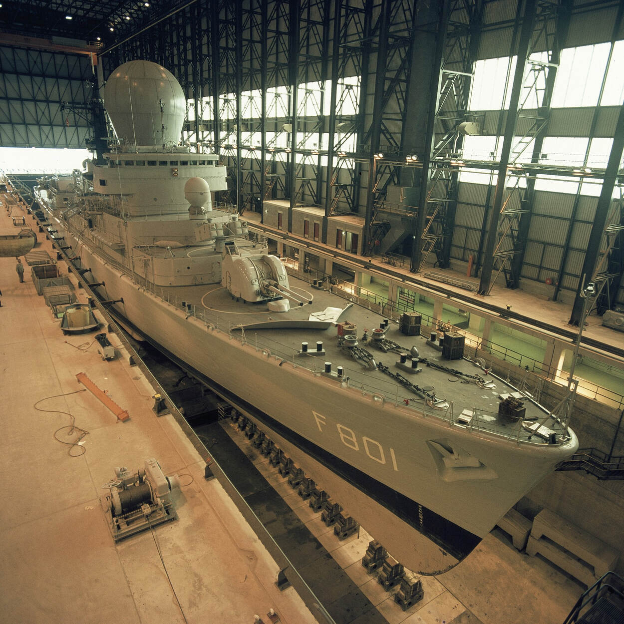 Geleide Wapenfregat Hr.Ms. Tromp in een overdekt droogdok.
