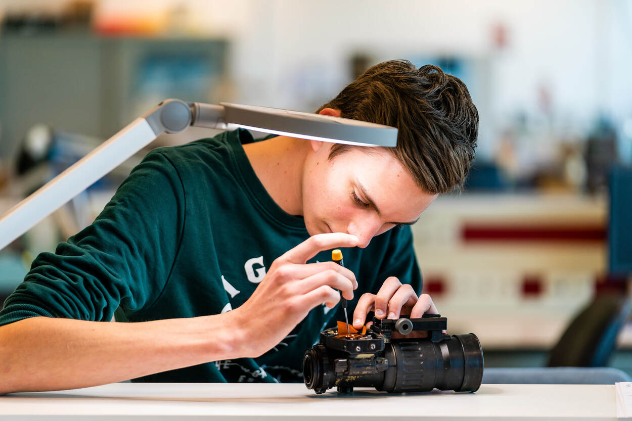 “We hebben ook kijkers van vliegers van de luchtmacht, de politiehelikopters en de traumahelikopters van de ANWB in onderhoud. Elke 180 dagen krijgen die een soort APK. Daarvoor gaan we het land in, langs de vliegvelden.” Nachtkijkers zijn er in verschillende groottes, hoe groter de diameter van het glas hoe groter de lichtopbrengst. Hoe groter, hoe meer onderdelen ook. “Soms wel honderden”, aldus Tim. “Heel veel elektronica en veertjes, dat kan priegelwerk zijn. Maar door veel ervaring op te bouwen leer je ze snel kennen. We krijgen ook cursussen van de fabrikant. Ze checken elk jaar of je het nog onder de knie hebt. Alleen dan mag je het onderhoud blijven uitvoeren.”