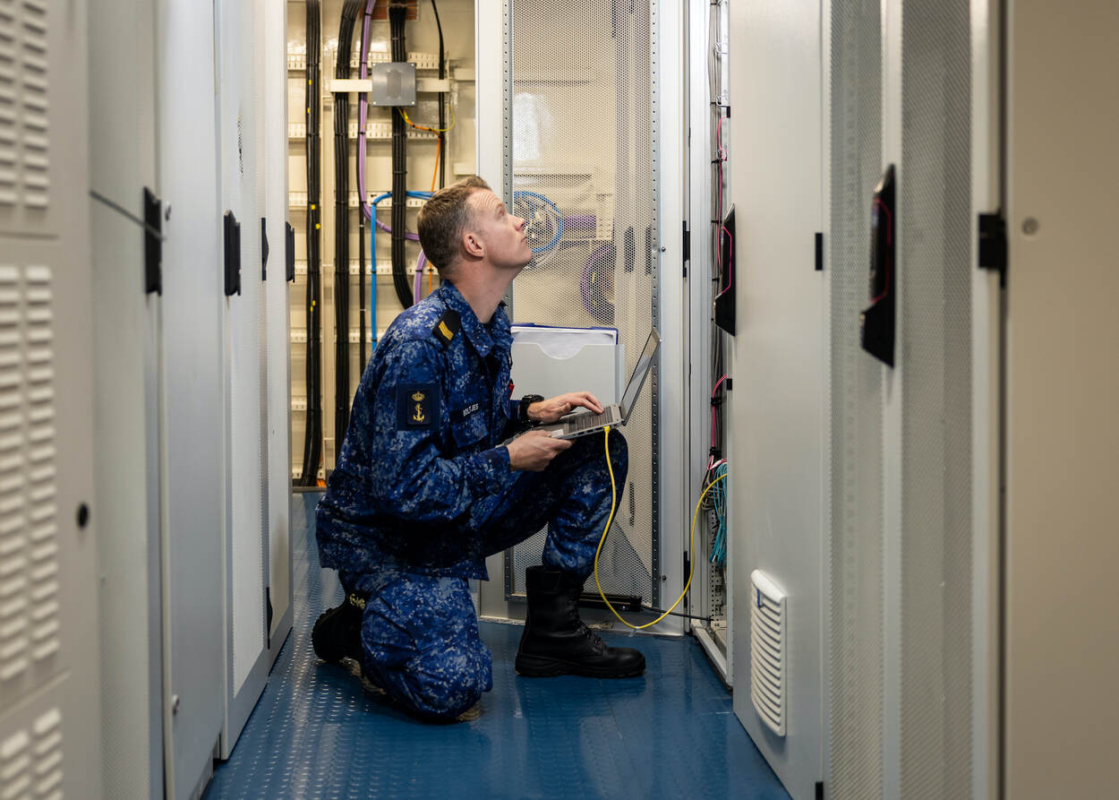Onder leiding van projectleider Terry werkt de afdeling Maritieme IT van JIVC, het IT-bedrijf van Defensie, aan de IT-systemen die aan boord van het nieuwe Combat Support Ship Den Helder moeten komen. “Omdat het schip een aantal nieuwe wapen- en sensorsystemen krijgt moet het centrale Combat Management System daarop worden aangepast. De softwareontwikkeling gebeurt in een virtuele omgeving in Den Helder. Daar wordt proefgedraaid zodat het over enkele weken kan worden uitgerold op het schip zelf. Op de werf van Damen Shipyards in Vlissingen wordt daarvoor de benodigde apparatuur zoals routers en servers ingebouwd.”