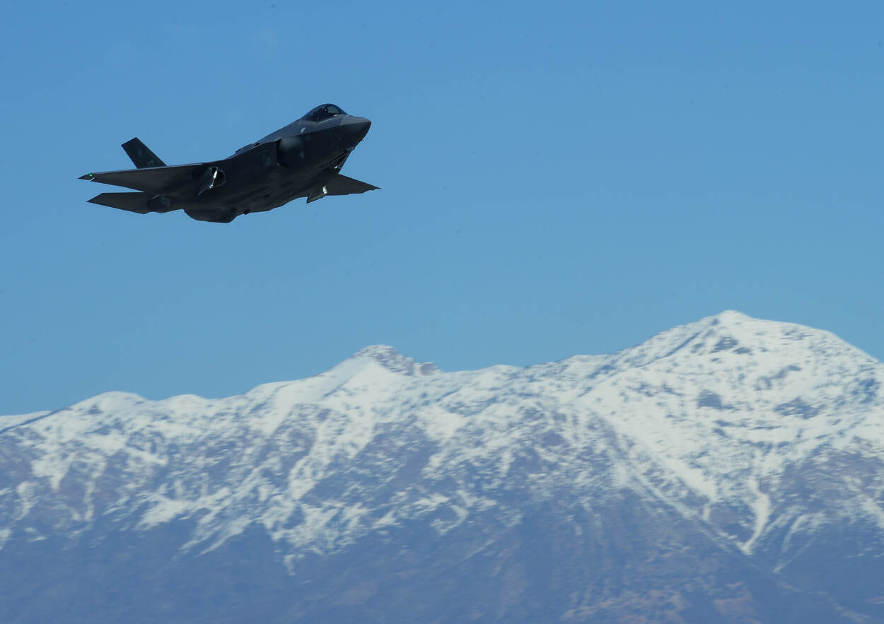 Een Amerikaanse F-35 boven de besneeuwde toppen van bergen.
