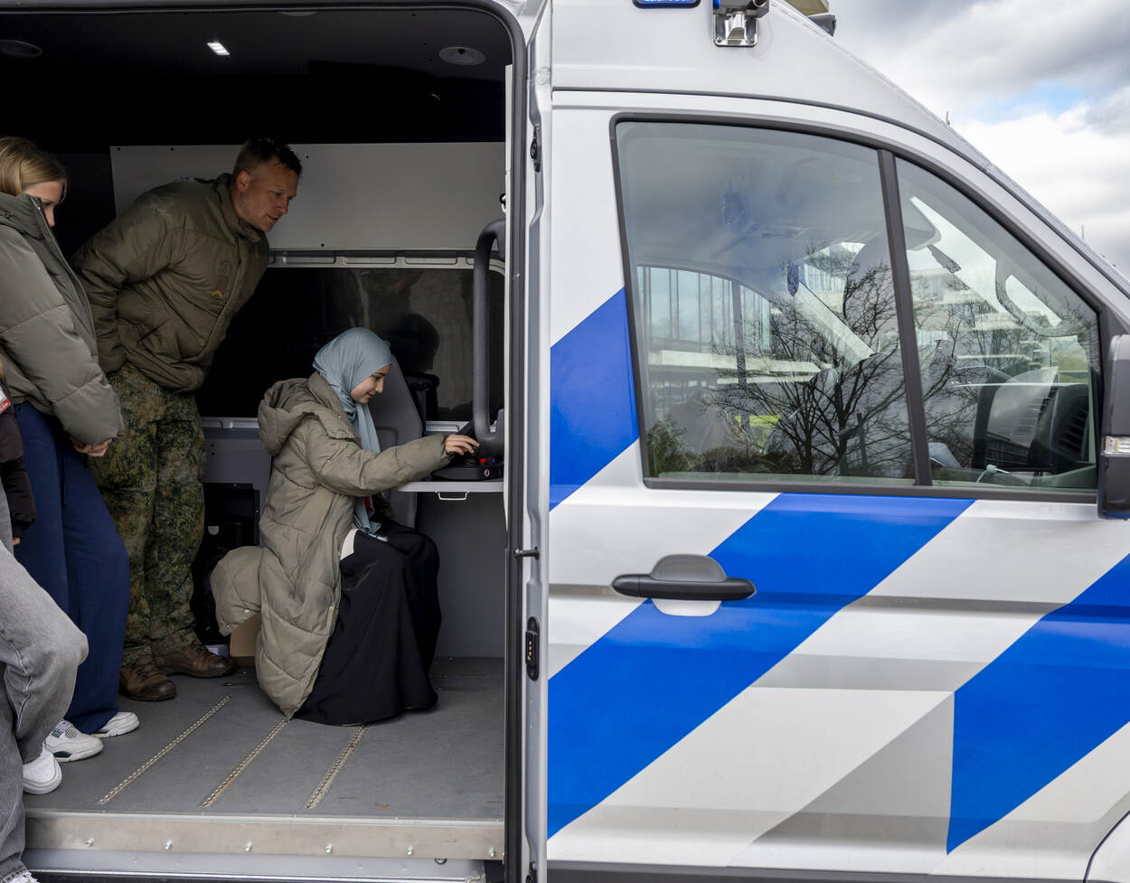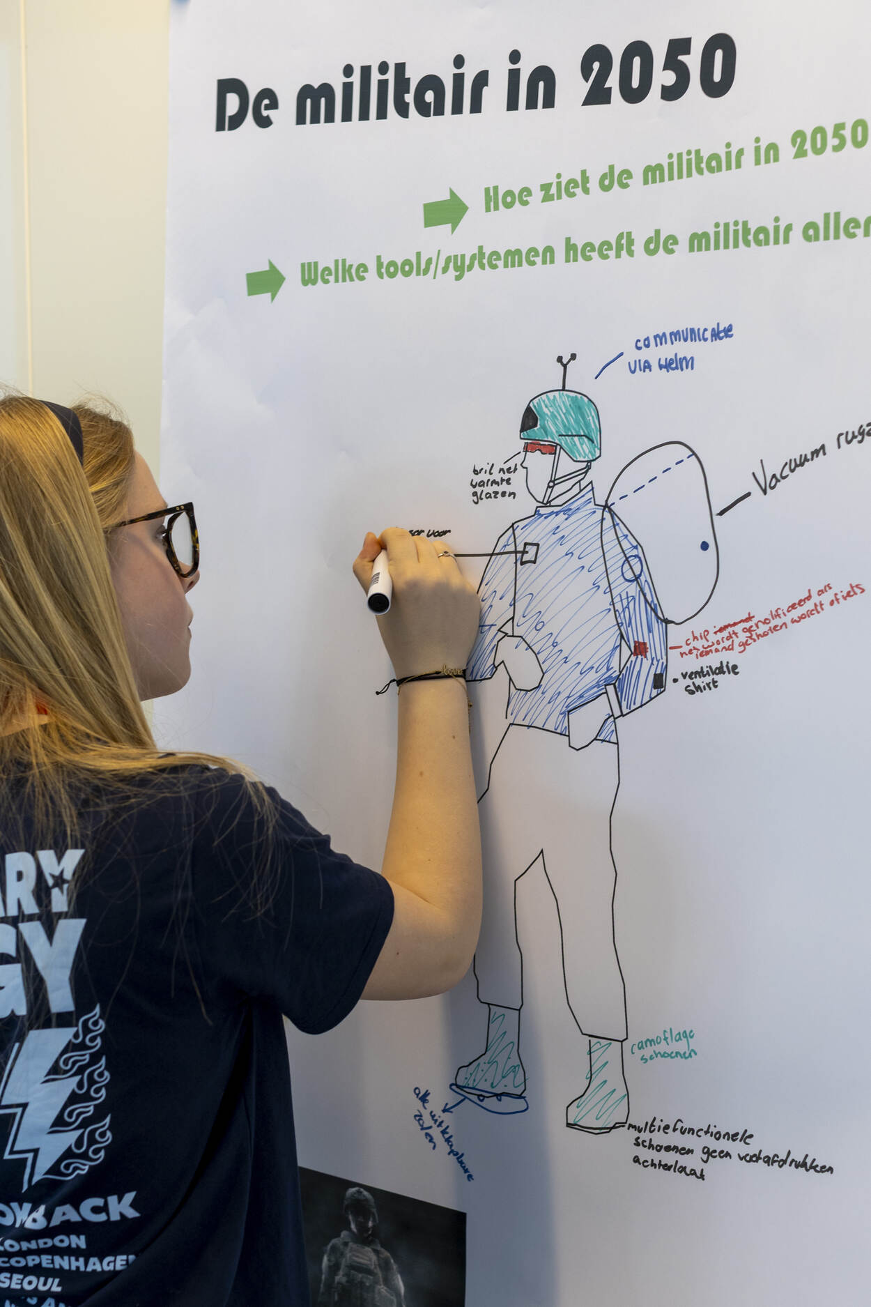 30 meiden van het Oosterlicht College in Nieuwegein tussen de 13 en 15 jaar bezochten 10 april de Kromhout Kazerne. “Ik heb me altijd afgevraagd wat zich achter de hekken afspeelt als ik hier langsrijd”, vertelt docente Helga voor ze één voor één het draaihek passeren. Daarachter gaan kantoren schuil, veel kantoren. Toch lukt het de organisatie de kinderen een breed beeld te geven. De groep van Helga start bij de Explosieven Opruimingsdienst. Even voelen hoe zwaar alleen al de helm is, maar wel voorzichtig. “Pas op, deze kost 27.000 euro”, waarschuwt sergeant-majoor Marcel terwijl de leerlingen ‘m behoedzaam doorgeven. Daarna mogen de bompakken aan. De groep reageert nog wat afwachtend. Loïs (14) is zo dapper om zich om te laten hangen met 32 kilo. “Megazwaar, je zou er niet in kunnen rennen.” De robot van de EOD scheurt op volle snelheid over de kinderkopjes tussen gebouwen K8 en K9 als de dames achter de knoppen plaatsnemen. “Dit was heel leuk”, stelt Berra (14). “Eigenlijk is alles veel interessanter dan ik dacht. Ik wist heel weinig van de militaire wereld.” Girl’s Day is een initiatief van de stichting VHTO, een expertisecentrum dat zich inzet voor de deelname van meiden aan de technische branche. Met deze derde editie wil COMMIT een zaadje planten bij potentiële collega’s. “Vandaag geven we mee dat Defensie veel meer te bieden heeft dan functies waarbij je moet vechten en schieten”, vertelt Kimberly, Stafadviseur Onboarding, Vitaliteit & Leerlijnen. “We laten veel meer kanten van techniek en IT zien. Ook in de rol van bijvoorbeeld burger of reservist.” De militair in 2050 heeft kisten die geen voetafdruk achterlaten, een shirt dat afkoelt met ingebouwde ventilatoren, een chip in de arm die verwondingen registreert en kniebeschermers die zichzelf opblazen bij het knielen. “Bij brainstormen mag álles, niets is fout en er zijn geen kaders”, geeft Ilse Kroesen de meiden mee. Als voorzitter Wapensysteemoverleg Militair is ze continu bezig met verbetering en vernieuwing van de uitrusting. De input van de nieuwe generatie kan ze maar al te goed gebruiken. “Ik ben steeds opnieuw verbaasd met wat voor leuke en goede ideeën ze komen.” Maar liefst 7 navigatieofficieren in de dop plotten routes over de hele wereld. Maar vanzelf gaat dat natuurlijk niet. Dankzij het spel van Dorien en Avelin van afdeling Maritieme Systemen (AMS) worden hordes opgeworpen als piraterij, natuurrampen en zelfs een zeemonster dat het roer overneemt. Normaal piekeren de instructeurs van vandaag over de technische snufjes die nieuwe schepen allemaal nodig hebben. Vandaag beantwoorden ze tientallen vragen, zoals ‘zinkt een schip wel eens?’. Dorien: “Laatst nog, een Russische. Met ons werk zorgen we ervoor dat dat voor de Nederlandse vloot zo moeilijk mogelijk gemaakt wordt.” Of de meisjes in de toekomst gaan solliciteren? Delaijla (15): “Ik dacht van niet, want ik wil de marketing in, iets met sociale media. Dat blijkt bij Defensie ook te kunnen, dus wie weet kom ik over een paar jaar terug.” Volgens docente Helga is werken bij Defensie écht iets voor Dia (14): “Ik denk dat de jongens uit de klas wel jaloers zullen zijn op ons, vooral omdat we het bompak mochten dragen”, stelt ze. Dia verduidelijkt dat ze nog steeds graag het onderwijs in wil. “Werken met jonge kinderen lijkt me heel leuk.” De organisatie is in ieder geval tevreden. Kimberly: “Als er uit de groep van vandaag over een paar jaar één of twee meiden zich melden, is het al de moeite waard geweest.”