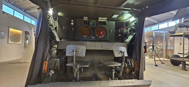 Man in burgerkleding poseert in cabine bij militair wapensysteem