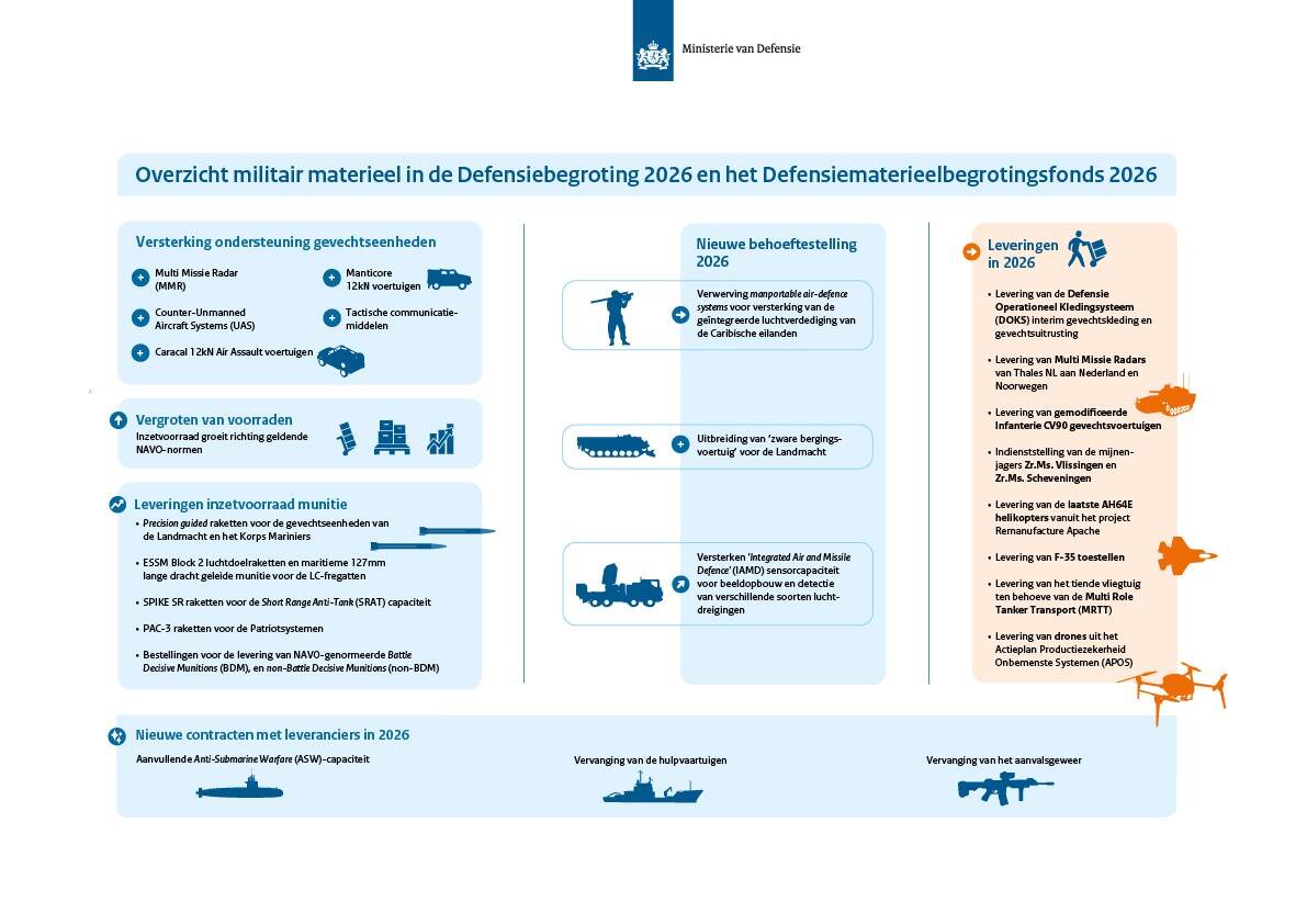 Volgens het Overzicht uitgaven 2026 is ruim 13 miljard euro voor ‘Instandhouding en verwerving van defensiematerieel’. Ongeveer een kwart gaat naar infrastructuur, vastgoed en digitalisering. Het gros van die 13 miljard euro is bestemd voor materieel. Denk aan voertuigen, schepen, vliegtuigen, bewapening, kleding en uitrusting. Verder steekt Defensie geld in lucht- en raketverdediging en in munitievoorraden. Voor 2025 ligt Defensie op koers om de begroting te realiseren.