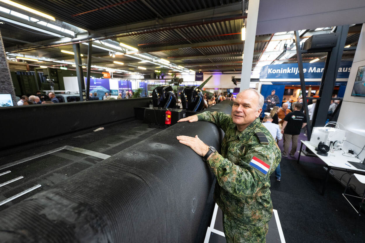 Je kon er niet omheen tijdens Purple NECtar X Innovation in Defence: de zwarte gevaartes die uit de 3D-printer zijn gerold, zoals deze grote boot. Het bedrijf dat deze klus in slechts 8 dagen tijd klaarde is CEAD, gevestigd in Delft. Dat gebeurde in samenwerking met het Expertisecentrum Addittive Manufacturing van de Koninklijke Marine. CEAD richt zich op de ontwikkeling en productie van grootschalige 3D-printers. Met gebruik van thermoplastische composietmaterialen zijn daarmee inmiddels boten geprint tot circa 12 meter lengte, ontworpen voor zowel civiele- als defensietoepassingen. En dat vindt commandant COMMIT vice-admiraal Jan-Willem Hartman belangrijk: de zogenoemde dual use. CDS generaal Onno Eichelsheim was net als de bezoekers onder de indruk.