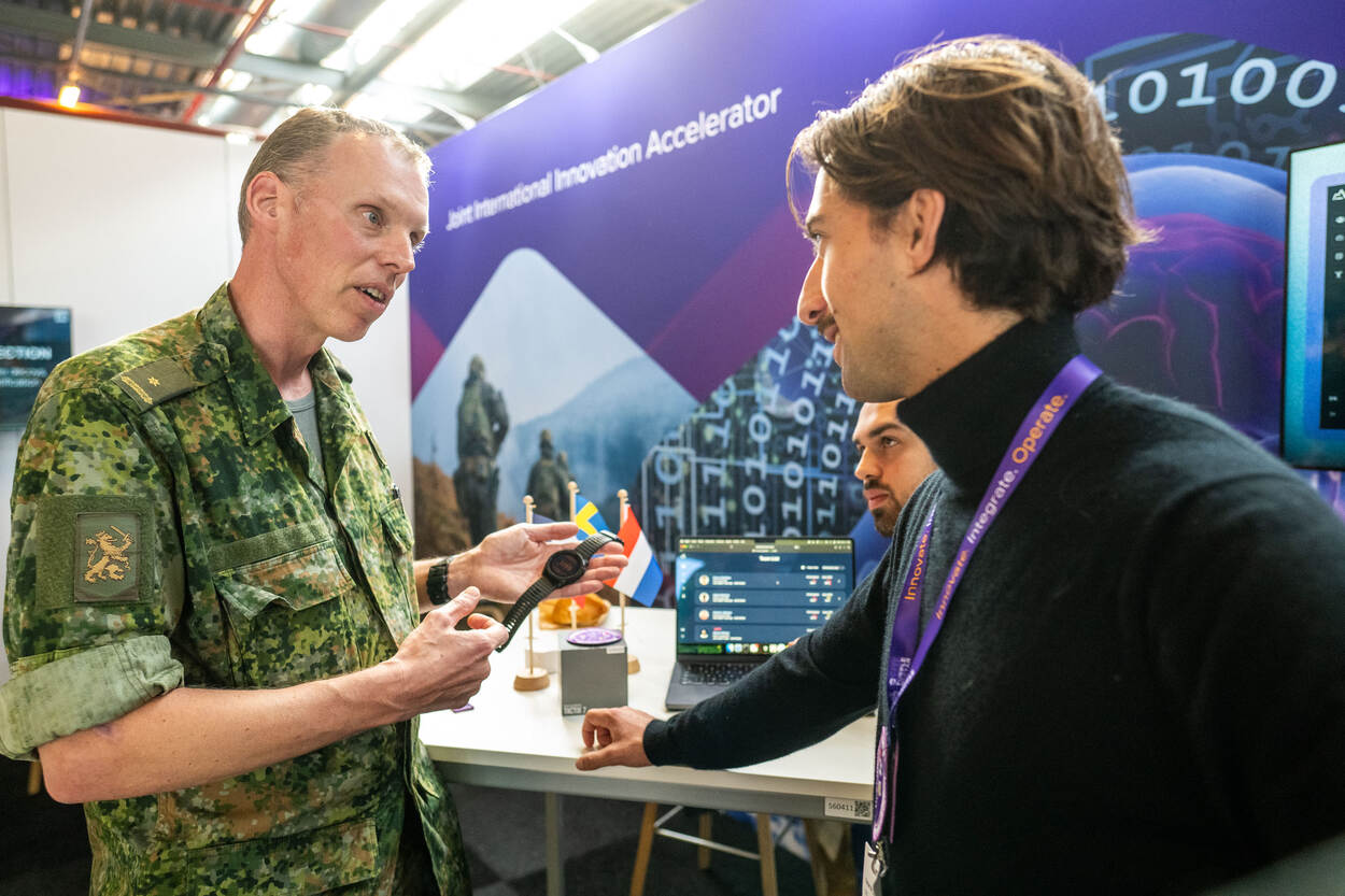 Het begon met een project binnen de afdeling Trainings Geneeskunde/Trainings Fysiologie (TGTF) om de fysieke en mentale component bij militairen meetbaar te maken. Inmiddels is het initiatief internationaal opgepakt samen met Zweden en Frankrijk. “Dit is uniek binnen de Europese defensie. Het programma maakt het mogelijk innovatieve projecten gelijktijdig te contracteren met start-ups uit elk van de deelnemende landen”, zegt Fons (Directie Kennis & Innovatie, COMMIT), aanjager van de Joint International Innovation Accelerator. “Dit horloge en de sensoren moeten straks een militair uitrustingsstuk worden, waarmee je niet alleen kunt meten, maar ook informatie krijgt tijdens een operatie”, volgens majoor Marnix.