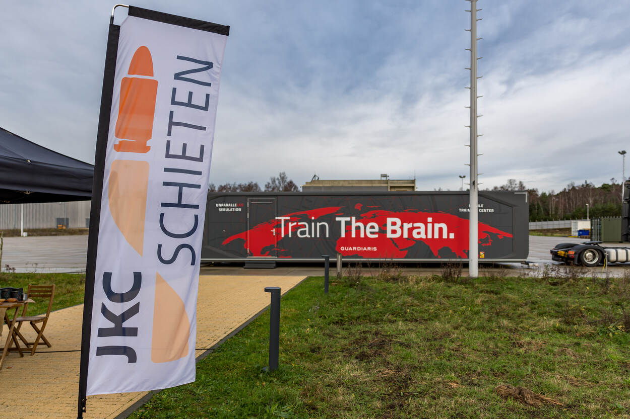 De truck van Guardiaris toert door Europa en kent een Nederlands tintje. Het Sloveens bedrijf heeft een partnerschap met Expandable Movable Spaces in Eersel. ”Een persoon kan dit modulair systeem in 15 minuten opzetten, een paar minuten om de computers op te starten en dan kan er 40 uur worden geoefend”, verkondigt hoofd verkoop van Guardiaris, Doris Skrjanec. “Het is echt inpluggen en trainen, met heel verschillende wapens.”