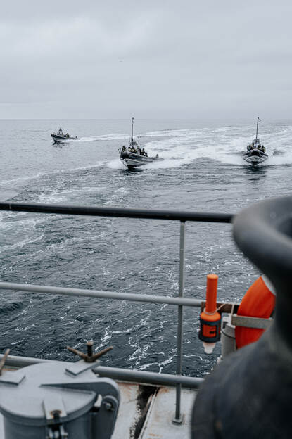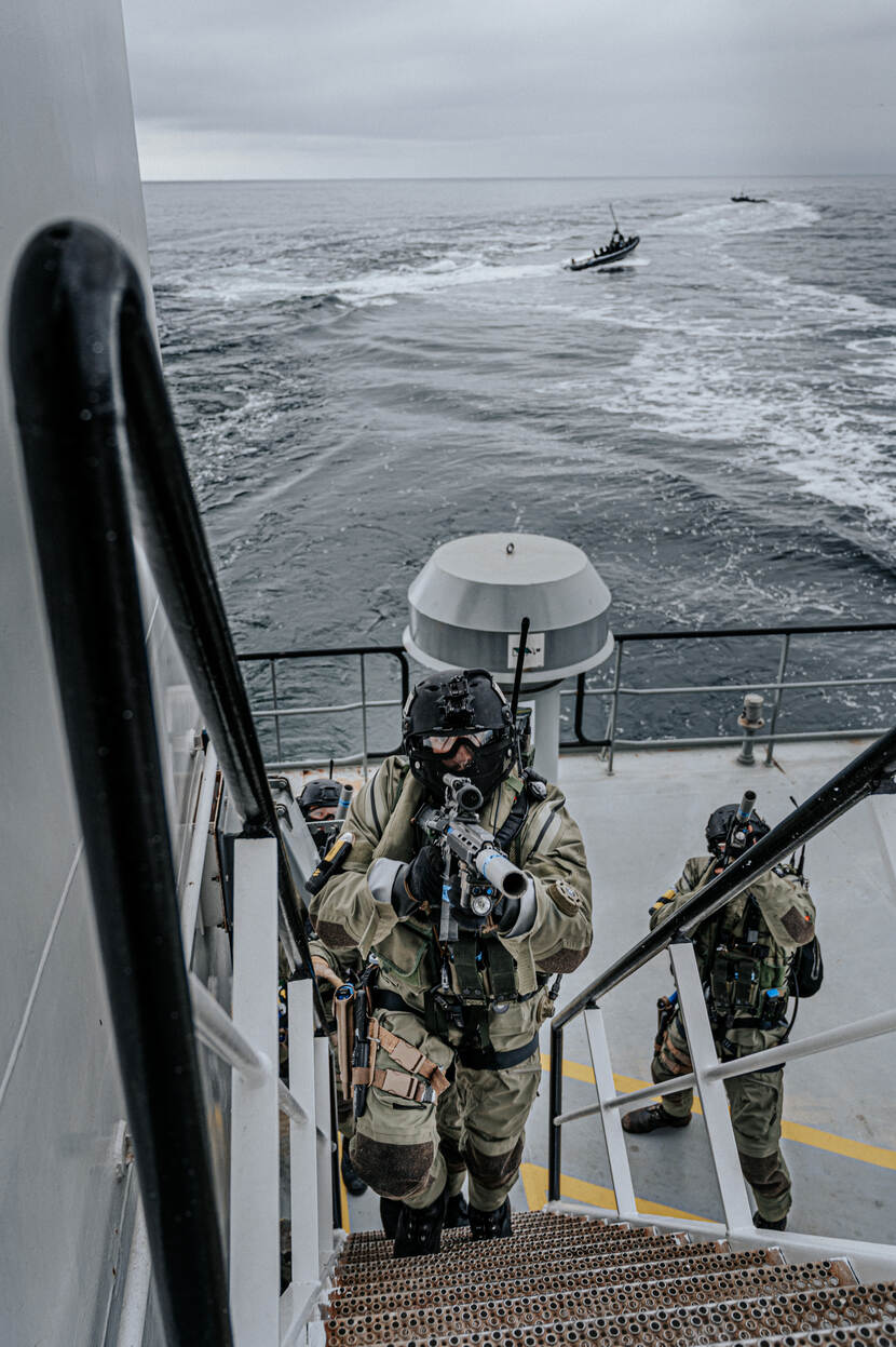Foto boven: Een cursist van de NLMARSOF-opleiding op de brug van een zogenaamd geënterd schip.