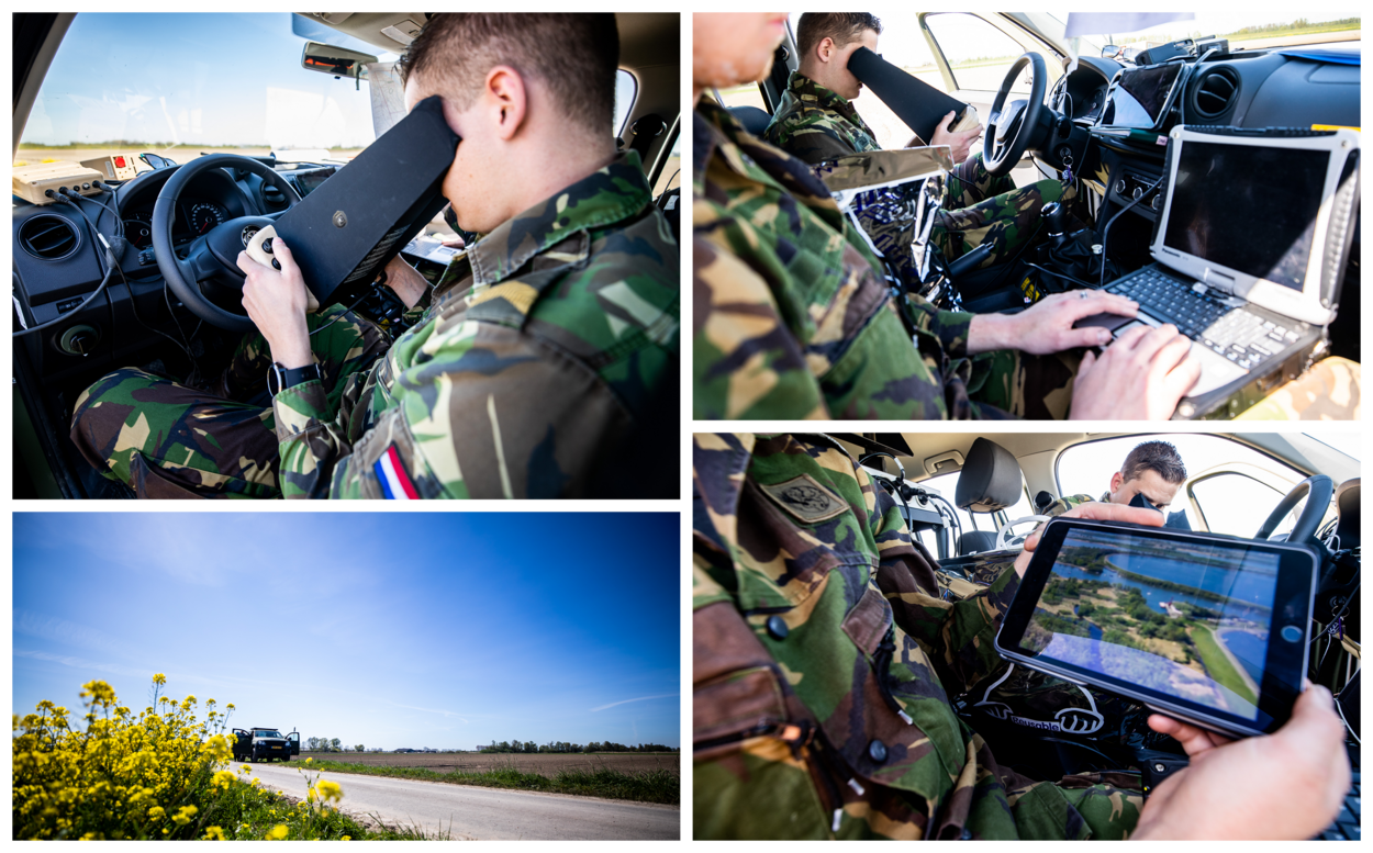 Gijs en zijn collega korporaal Kelvin (24) besturen het apparaat vanuit een weiland, met toestemming van de boer. Continu houden ze contact met de commandopost op het politiebureau, waar de operatie wordt aangestuurd. De 2 liaison officers (LSO’s) van de landmacht geven steeds door waar de drone beelden moet maken. Kelvin: “Die wensen komen bij de politie vandaan, maar omdat zij in de omgeving bekend zijn, werken ze vaak met straatnamen. De landmachtcollega’s vertalen die voor ons in coördinaten zodat we de Puma eropaf kunnen sturen.”