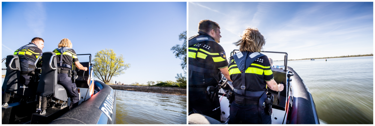 Hoewel het overgrote deel van de mensen op dringend advies thuis of in de buurt van huis blijft, genieten ook genoeg dagjesmensen op en om het water van de natuur. “We zien een rij klapstoelen op een strandje aan de Merwede, kunnen jullie daarnaartoe?”, klinkt het vanuit de commandopost door de radio op de politieboot.