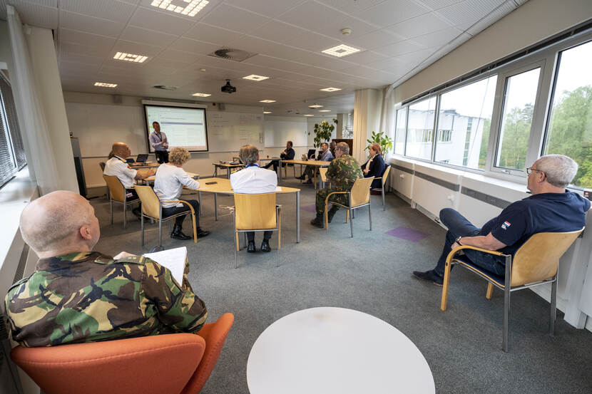 Behalve acties in het heden, kijken bij de sectie Langetermijnplanning van het LOT-C 2 man gericht naar de toekomst. “Langetermijnplanning deed ik de afgelopen jaren op 2 internationale hoofdkwartieren”, zegt luitenant-kolonel Richard Schulte van het Landwarfare Centre. “We kijken naar de zomer van 2021 en 2022. In een snelkookpan proberen we hier in 1 maand een plan op papier te hebben.” “Hoe kunnen we overgaan naar het ‘nieuwe normaal’ en hoe ziet dat er dan uit, bekeken vanuit de veiligheidsketen”, besluit zijn collega generaal-majoor b.d. Hans van der Louw. “De pijnlijke boodschap is dat we hier nog wel even bezig zijn.”