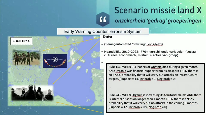 Stel je ‘land X’ voor waar van alles aan de hand is. Er zijn tal van (terroristische) groeperingen die aanslagen plegen en zorgen voor een instabiele omgeving. Al enige tijd is er zicht op dat land en er loopt een NAVO-missie. Maar hoe krijg je een beter beeld van deze groeperingen? In dit fictieve scenario is er een systeem waarmee in tien jaar tijd zo’n 770 variabelen zijn verzameld. Denk aan sociale, politieke en economische informatie. Met behulp van een algoritme wordt deze grote hoeveelheid informatie geanalyseerd, waaruit een aantal ‘regels’ voortkomen. Deze regels zeggen iets over de kans dat een bepaalde groepering een aanslag gaat plegen, bijvoorbeeld op een strategisch gelegen haven in land X.