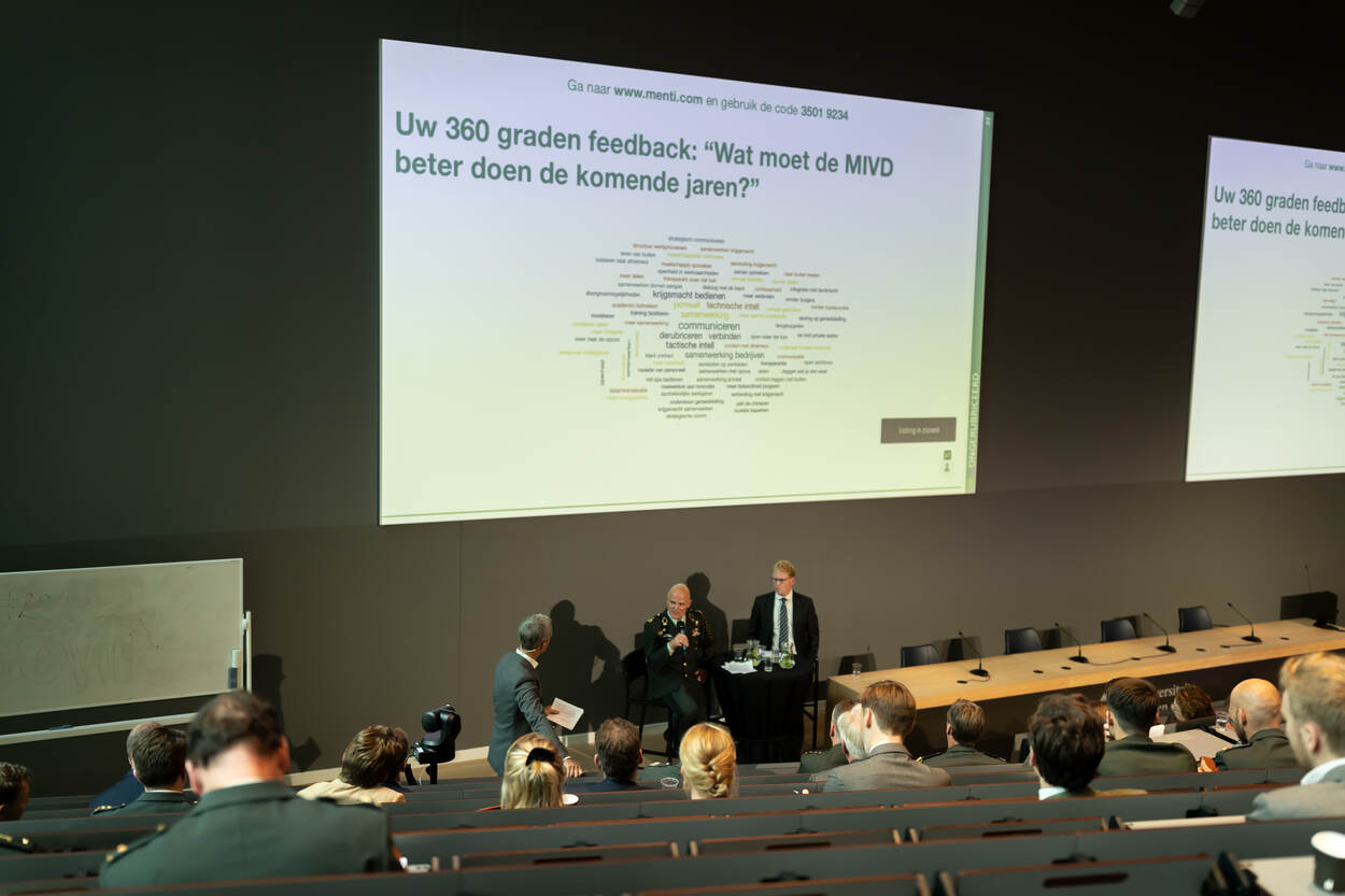 Door middel van een Mentimeter wordt het publiek gevraagd om te reageren op een drietal vragen. De directeur van de MIVD en zijn plaatsvervanger reageren.