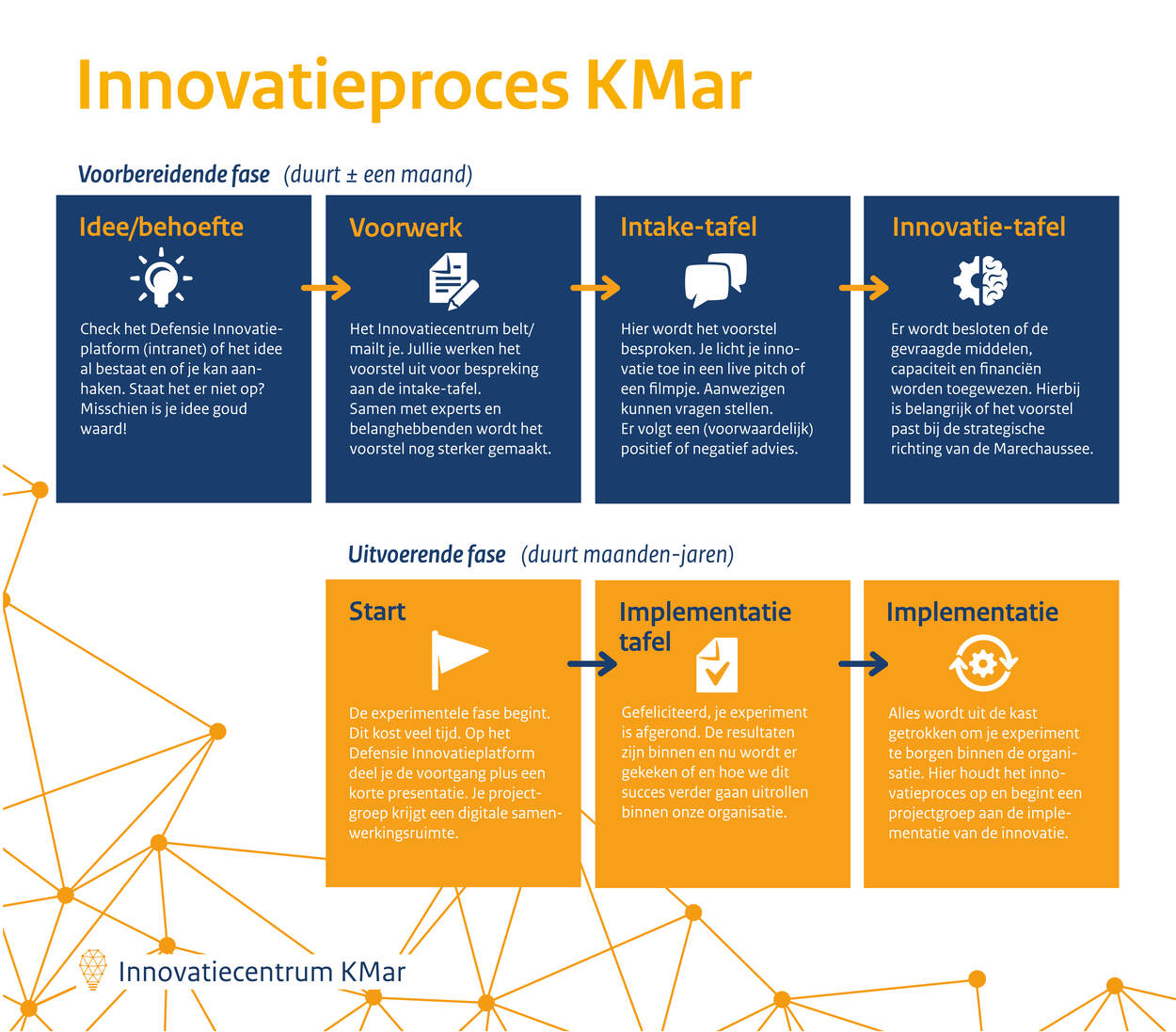 In deze infographic lees je precies welke stappen er zijn als je een innovatief idee aandraagt. Een uitgebreidere infographic vind je op intranet. Heb je een innovatief idee? Mailen kan altijd naar innovatiecentrumkmar@mindef.nl.