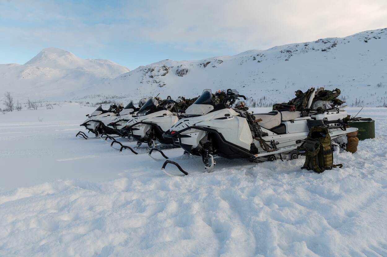 Verplaatsingen op de Noordflank zijn lastig, maar sneeuwscooters bieden geregeld uitkomst. (Foto: Korps Mariniers)
