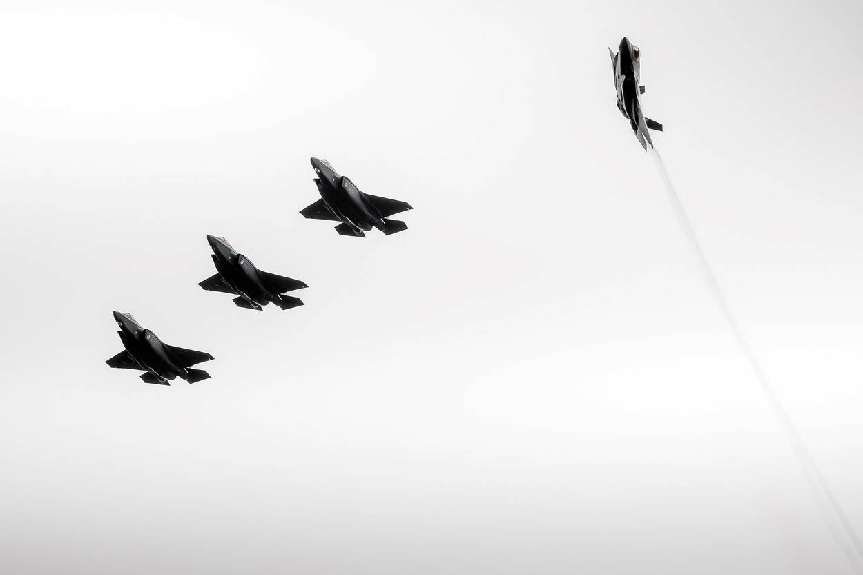 Foto links en rechts: F-35’s op de startbaan tegen een grijze wolkenlucht.
