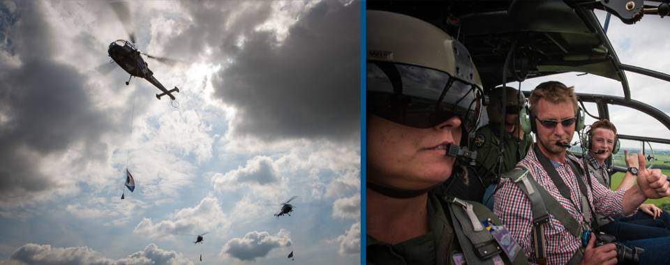 Boven en rechts: Vanwege de 50ste verjaardag van de Alouette III verzorgden 3 van de nog 4 operationele toestellen een vliegdemonstratie. Foto's: sergeant-majoor Arnoud Schoor.