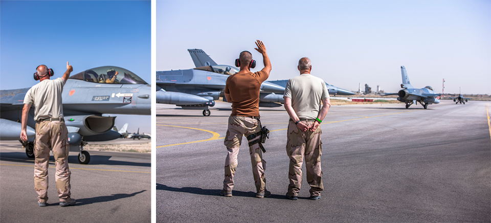 “Net als in Nederland bij het 322 Squadron op Leeuwarden ben ik bij de ATF crewchief. Ik ben verantwoordelijk voor de visuele inspecties aan de F-16’s. Dit doe ik samen met de vlieger voordat de vlucht begint. We werken aan de hand van een checklist. De werkzaamheden hier zijn gelijk aan die in Nederland. Alleen de omgeving is anders en de lijnen zijn hier wat korter. Je werkt samen in een kleine groep en regelt hier dus alles met elkaar. Ik besef heel goed dat ik een belangrijke verantwoordelijkheid heb en dat alles goed gecontroleerd moet zijn. Uiteindelijk stapt er een vlieger in de kist en wil ik dat die heelhuids terugkomt.”