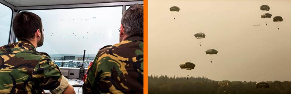 11 Luchtmobiele Brigade organiseert de jaarlijkse paradropping op de Ginkelse Heide. De KLu ondersteunt, onder andere met een display director. Kapitein Freek Bouwhuis van Maritiem Vliegkamp De Kooy (rechts) en kapitein Stijn de Graaf van het AOCS Nieuw Milligen regelen het vliegverkeer boven de heide. Daarbij krijgen ze veel ondersteuning van dit radarstation, want telefoonverbindingen zijn door de drukte amper te gebruiken. Bouwhuis: “Ook bij dit soort evenementen geldt: veiligheid voorop.”