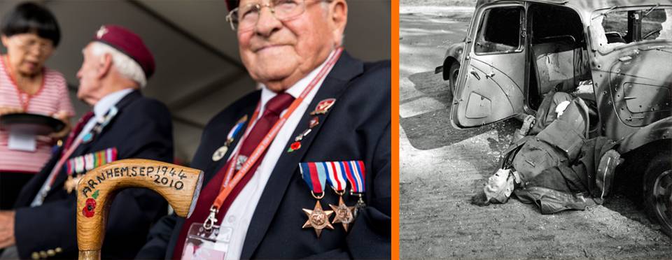 Soldaten Joe McAllister (links, 90) en Joseph Mawdsley (89) kennen elkaar niet tot ruim 20 jaar geleden. Dan komen ze op 500 meter van elkaar te wonen en leren ze elkaar via via kennen. Mawdsley landt op 17 september per parachute en McAllister een dag later met een Horsa. “Daar leek het eerst niet op”, zegt hij, “want de dag ervoor werd de vlucht na zo’n 50 mijl afgebroken. We gingen terug naar Broadwell. Dat was het dan voor mij, dacht ik. Maar nee, de volgende dag dus weer. In het bos bij Wolfheze bediende ik het Projectory Infantery Antitank weapon. Ik moest op een gegeven moment naar de overkant van de weg om ontstekers te halen. Een Duitse sniper schoot me toen neer. Ik raakte gewond aan mijn schouder en rug.”
