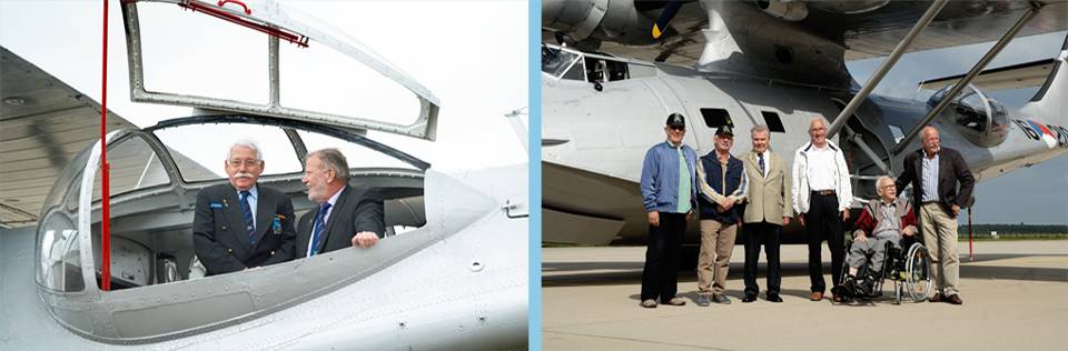 Veteranen poseren voor en in de Catalina van de Stichting Exploitatie Catalina PH-PBY. De andere 2 voormalige militaire luchtvaarttoestellen zijn de Spitfire en Harvard van de Koninklijke Luchtmacht Historische Vlucht.