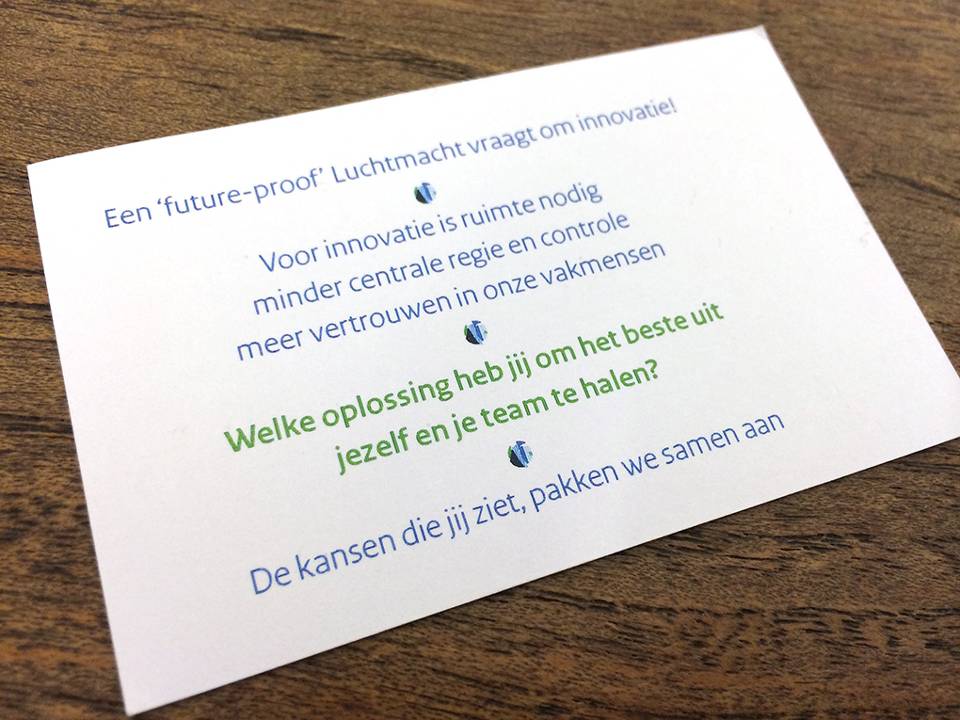 Maar dat gaat niet zomaar. Voorbeeld: Edison ontdekte niet 1 manier om licht te laten branden. Hij vond namelijk heel veel redenen om het licht níet te laten werken. Sluiter: “Zo is het ook met de innovatie bij de luchtmacht. Je moet heel veel projecten bedenken om uiteindelijk 5 procent te realiseren. Je moet dus heel veel in de spreekwoordelijke trechter stoppen, wil er uiteindelijk een bruikbaar project uitkomen. We hebben dus alle luchtmachters nodig om de organisatie samen te vernieuwen.”