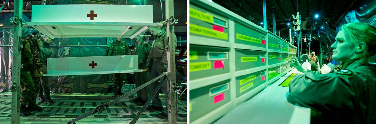 De twee vliegtuigen voor de oefening, een Nederlandse C-130 en een Belgische Embraer ERJ-135, zitten dan ook tjokvol medische apparatuur en voorraden. “Of het nou gaat om een gebroken been, oogletsel of een schotwond; wij moeten patiënten zo veilig en comfortabel mogelijk van A naar B brengen”, aldus Arjen.