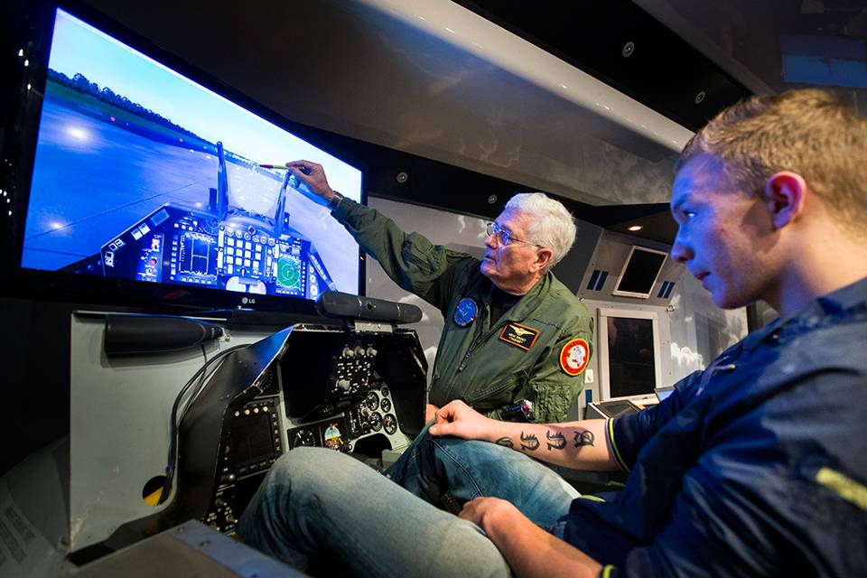 Medewerker van Bureau Evenementen Henk Drost geeft tekst en uitleg bij de simulator van de F-16.