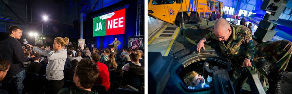 Foto links: De stelling van het einddebat was: ‘Ik ben overtuigd om bij Defensie te gaan werken, ja of nee’. Degene die hierin zijn mening volgens Schnitger het meest overtuigend verwoordde, won een vlucht in een KDC-10. Foto rechts: De static show met land-, zee- en luchtmachtvoertuigen trok veel bekijks.