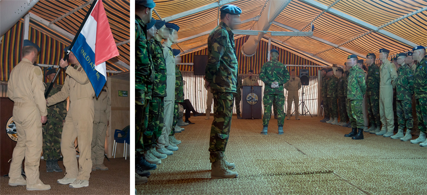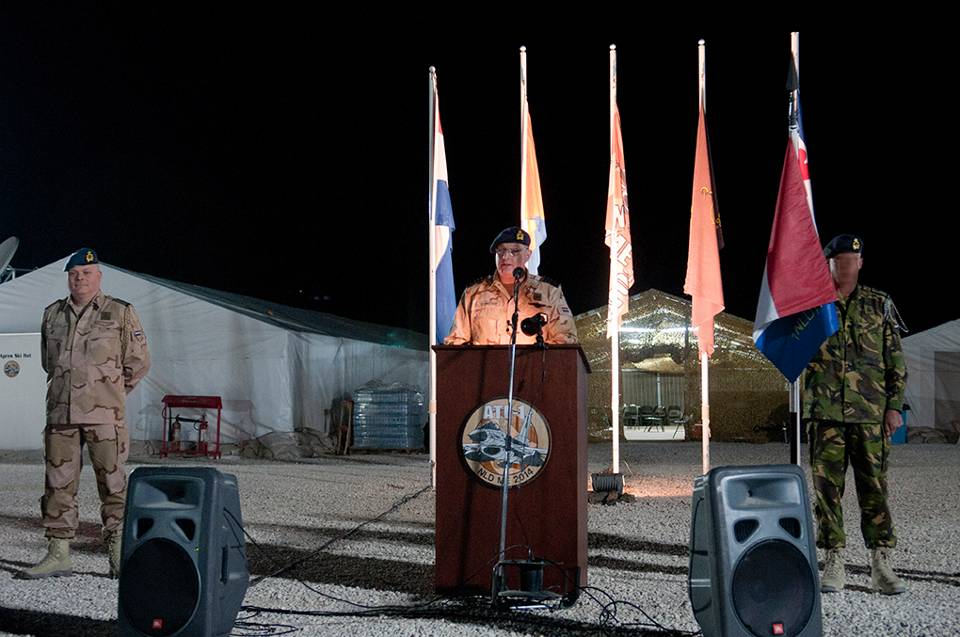 Op 7 januari droeg de eerste detachementscommandant van 1(NLD)ATF-ME het commando officieel over aan zijn opvolger. Directeur Operaties commodore Onno Eichelsheim, gaf aan hoe bijzonder deze missie is voor de Koninklijke Luchtmacht: “Jullie hebben de snelste deployment ooit in de historie van de Koninklijke Luchtmacht bewerkstelligd, naar een zogenaamde bare-base locatie.” Foto: Defensie