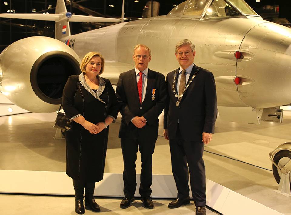 De traditionele Nieuwjaarsreceptie van de commandant Luchtstrijdkrachten op 9 januari, werd voor het eerst gehouden in het Nationaal Militair Museum (NMM) op de voormalige vliegbasis Soesterberg. Bij die gelegenheid werd een volstrekt verraste dr. Jan Janssen, tot voor kort directeur van het inmiddels gesloten Militaire Luchtvaart Museum, benoemd tot Ridder in de Orde van Oranje Nassau. Jan Janssen heeft “een cruciale rol gespeeld bij de totstandkoming van het nieuwe museum. Er is veel waardering voor zijn inzet en toewijding en voor de wijze waarop hij als militair-historicus zijn gehele loopbaan bij Defensie de geschiedenis van onze krijgsmacht onderzoekt en voor het voetlicht brengt”, aldus burgemeester Charlie Aptroot van Zoetermeer. Hij reikte de koninklijke onderscheiding uit. “Dit is een mooie waardering voor het werk dat ik 14 jaar lang heb verzet om de geschiedenis van de krijgsmacht de plek te geven die hij verdient”, reageerde Janssen die het NMM-concept mede ontwikkelde. Foto: Defensie