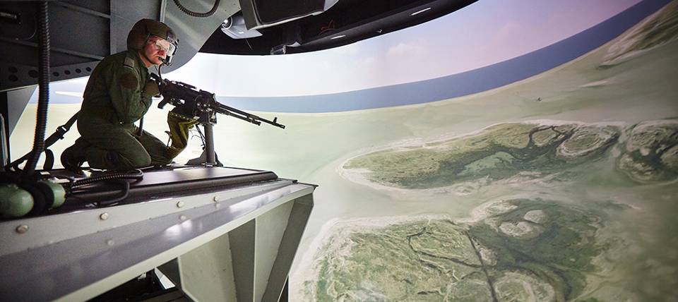 Zorgvuldig stijgt adjudant Paul Arends op met een NH90 van Marinevliegkamp De Kooy. Niet in het echt in Den Helder, maar in de nieuwe doorgunner simulator op Gilze-Rijen. “Je waant je meteen écht boven De Kooy. Hiermee kunnen we de doorgunners voor zowel de Chinook als de Cougar of de NH90 opleiden. Deze simulator overtreft alle verwachtingen die we aan het begin van dit project hadden.”